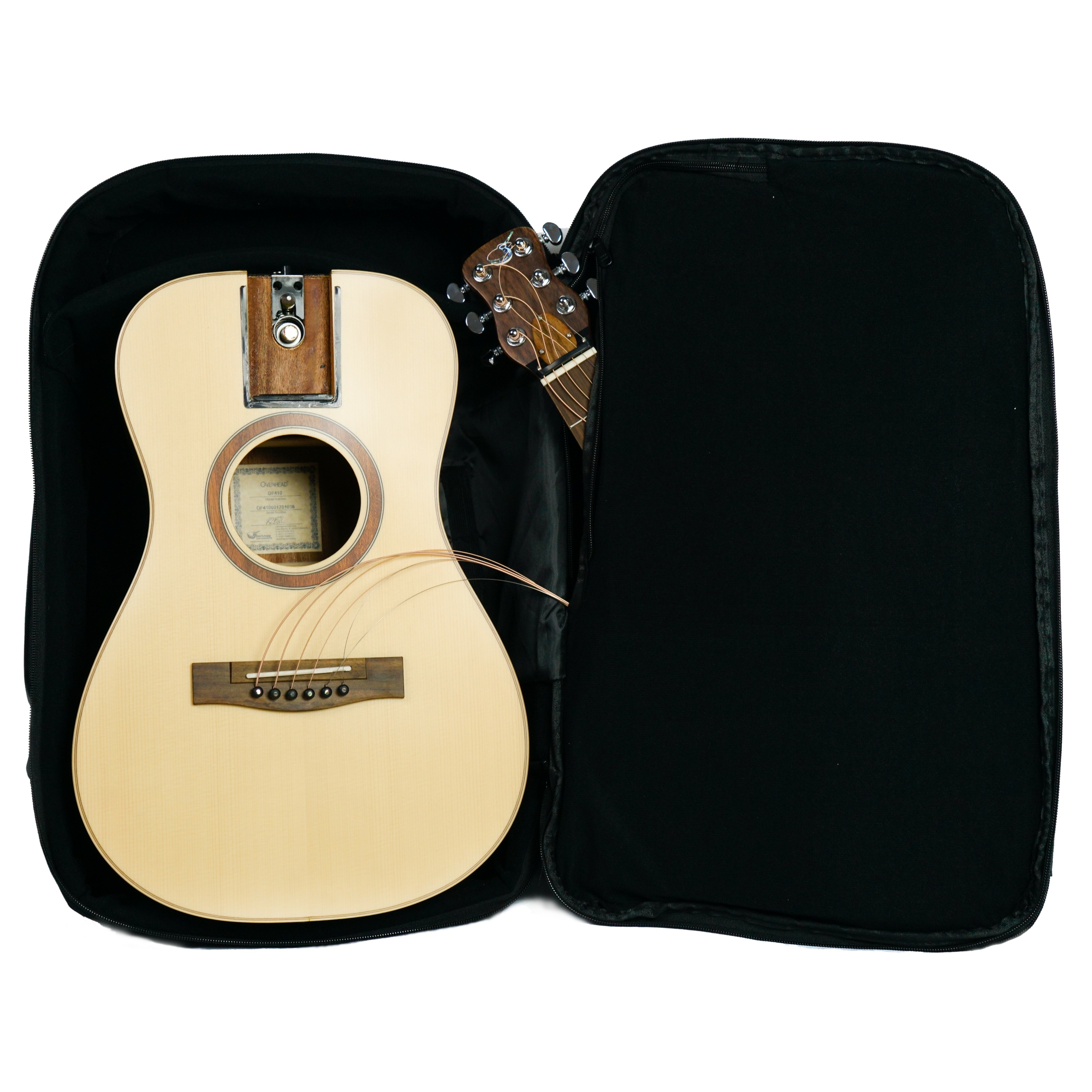 The OF410 OverheadĀ® collapsible acoustic travel guitar features a solid sitka top with layered African mahogany sides/back and collapses to carry-on size of 22*14*9 inches! It assembles in 20 seconds with our patented detachable neck system thatās guaranteed for life. A full 24.5 inch scale, a versatile 1 3/4 nut width best-in-class components, and a wedged ergonomic design make this the most enjoyable guitar youāll ever play! Tri-piezo pickup and a full-featured TSA compliant carry-on backpack included. (If viewing product category list, click on product image on the left to view full specs, otherwise scroll down for specs and media.)