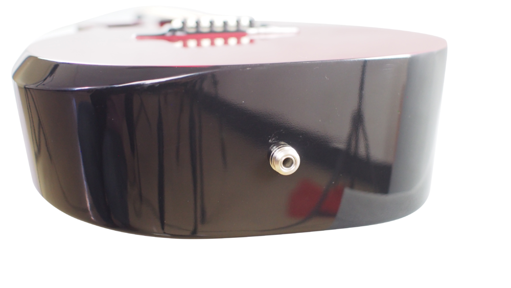 This particular guitar has the body and neck connected via a patented fast-release joint that allows for easy packing into the included gig bag….