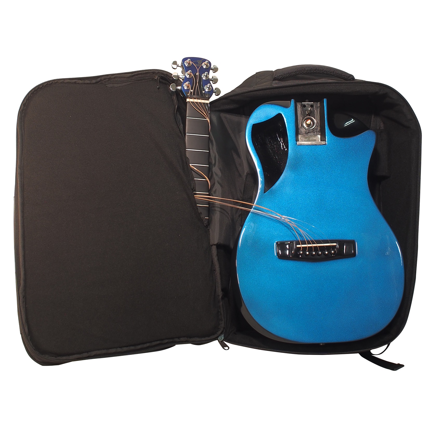The Blue Purple Color-Shift carbon fiber travel guitar changes color between blue and purple depending on the lighting. The OF660BP collapses to carry-on size of 22*14*9 inches! It assembles in 20 seconds with our patented detachable neck system, and our patented soundboard technology and all-carbon construction create a durable instrument with massive tone. A full 24.5 inch scale, a versatile 1 3/4 nut width, best-in-class components, and a wedged ergonomic design make this the most enjoyable guitar you’ll ever play! Tri-piezo pickup and a full-featured TSA compliant carry-on backpack included. (If viewing product category list, click on product image on the left to view full specs, otherwise scroll down for specs and media.)